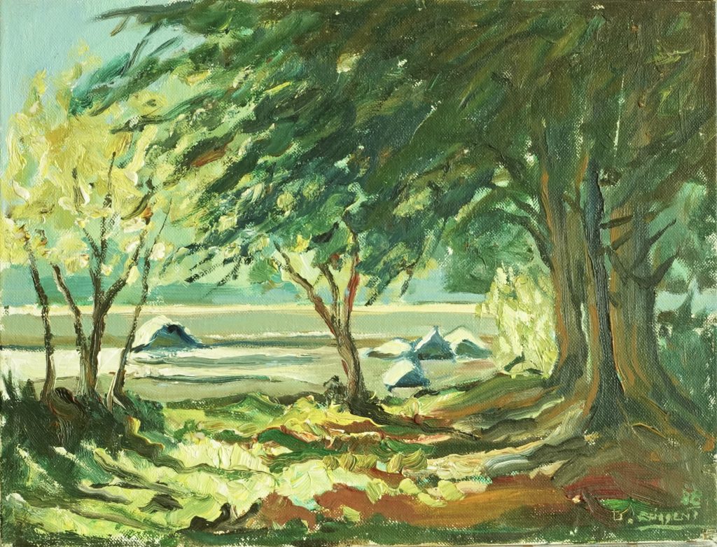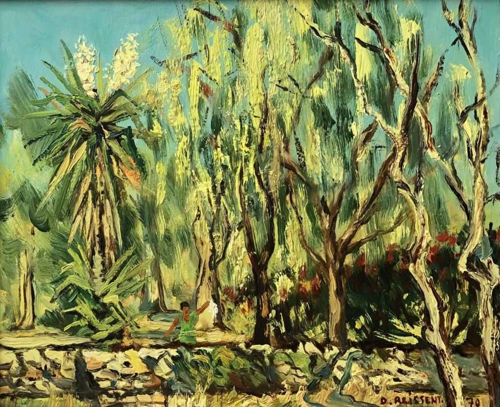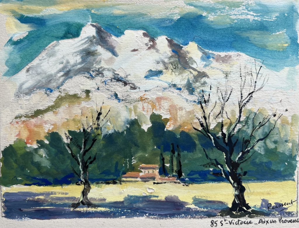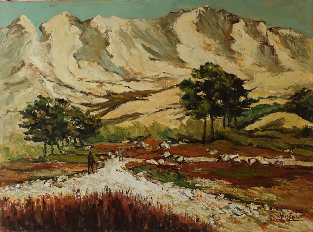 1980年盛夏时节的景象,色彩依然鲜亮,展现了夏季的热烈和活力。Reissent通过对夏季光影和色彩变化的把握,表现了Le Moustiers-Sainte-Marie在炎热季节中的生动和清新。1980年代的法国经历了经济改革和社会变迁,艺术家们更加关注个体和社会的关系,同时也对自然环境进行了深入的思考。这种风格和色调可能反映了个人对社会变迁和环境变化的内心感受,夏季的热烈和活力也可能是对快速变化时代的艺术回应。